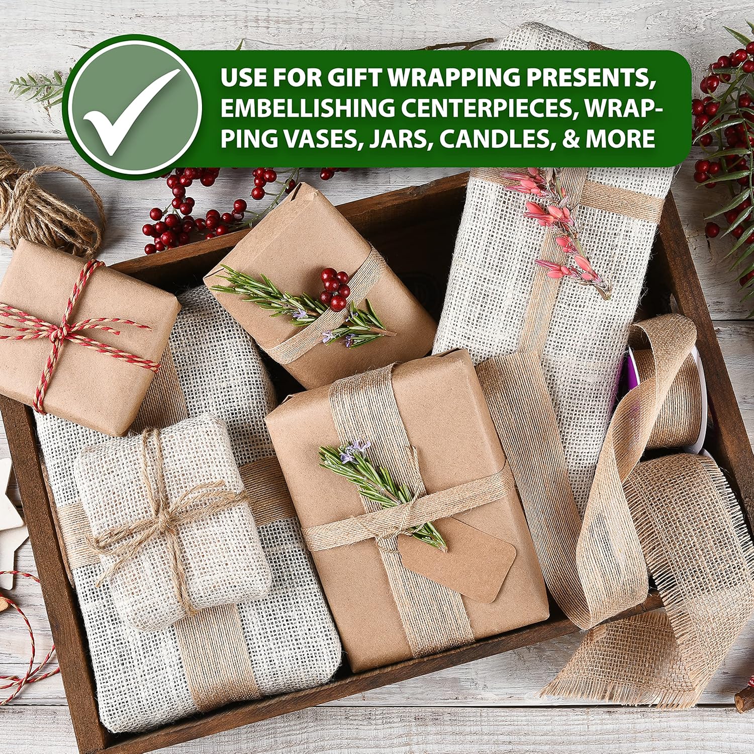 - Burlap Tan Ribbons for Wrapping, DIY, Scrapbooking, & Floral Arrangement: The rustic ribbon is the ideal-colored burlap fabric for garlands, bows, flower, cards ornaments & curtains tiebacks and gift wrapping ribbon for boxes & baskets.