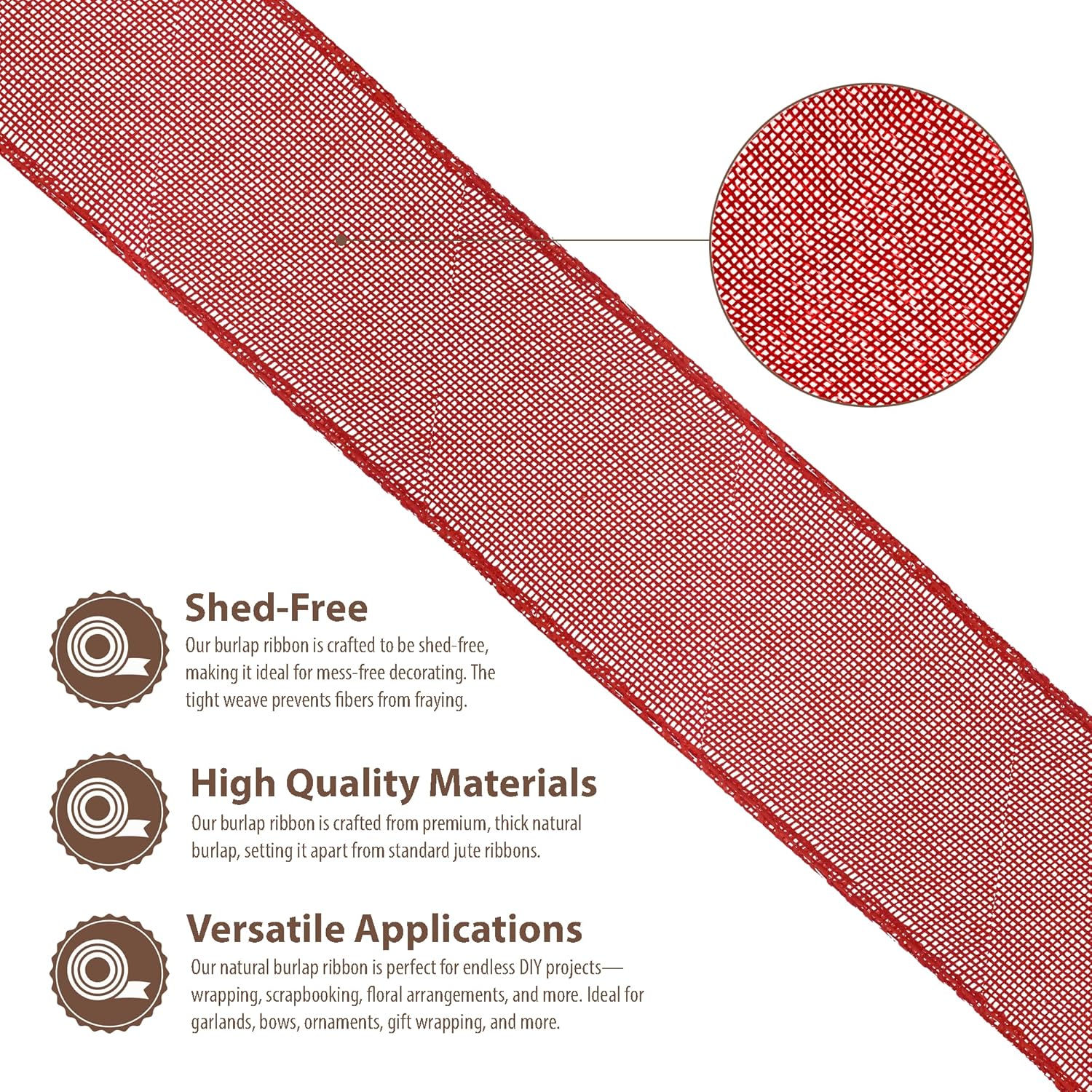 - Wired Burlap Ribbon: Compared to other jute burlap ribbons, our rustic burlaps ribbon with a fray & shed-resistant hemmed edges is made from thicker red burlap fabric. The indoor & outdoor colored burlap crafts ribbon is colorfast and will not bleed.