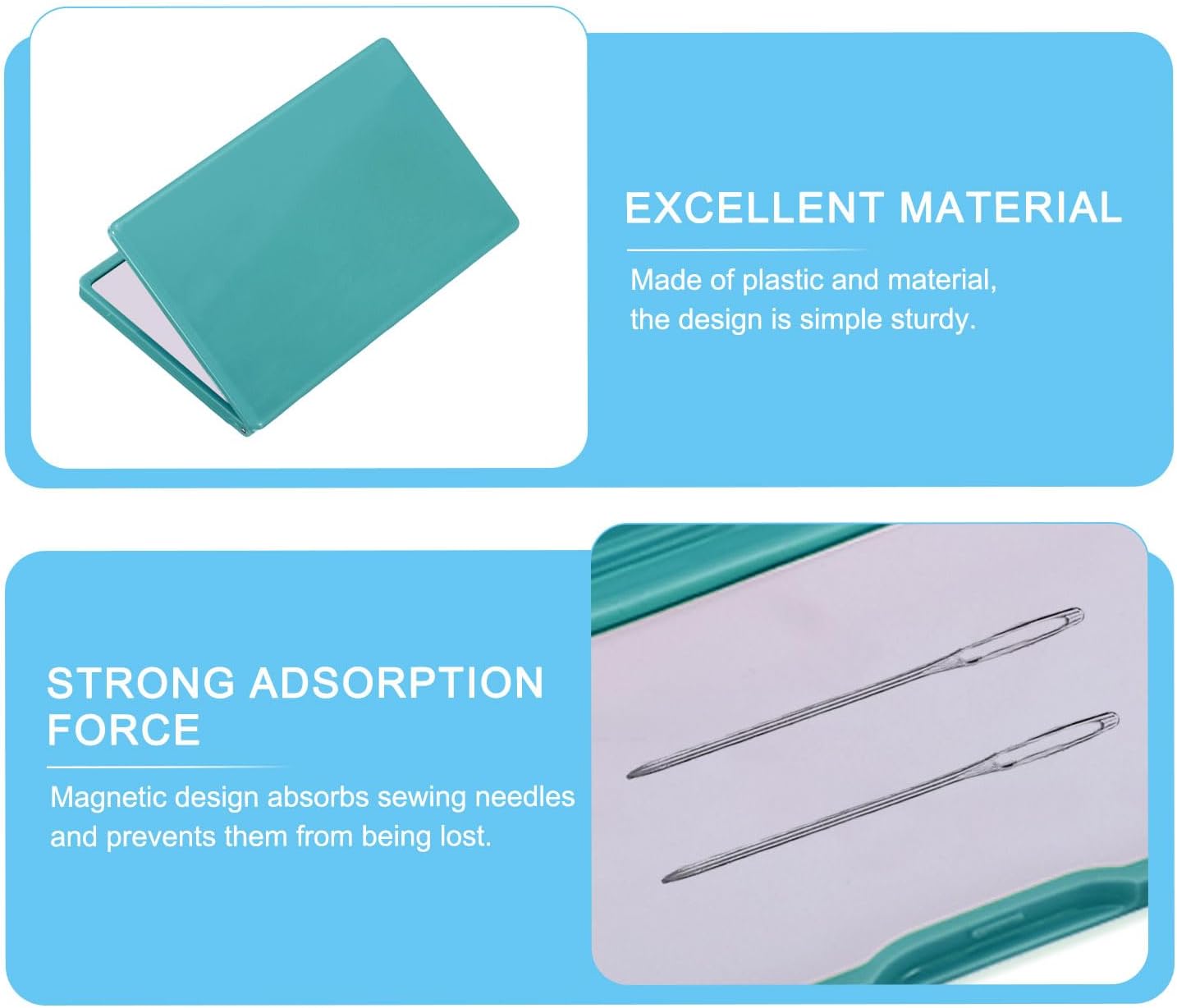 - Advantage: 1. The sewing needle keeper is magnetically designed to absorb sewing needles and prevent them from being lost. 2. The needle organizer is designed to be lightweight and portable, and can be easily stored and carried in various occasions without taking up much space. 3. The Needle case is made of plastic and magnets. The design is simple and sturdy, with no burrs on the surface and edges. It is secure to use and not easy to hurt your hands, suitable for beginners to practice sewing.