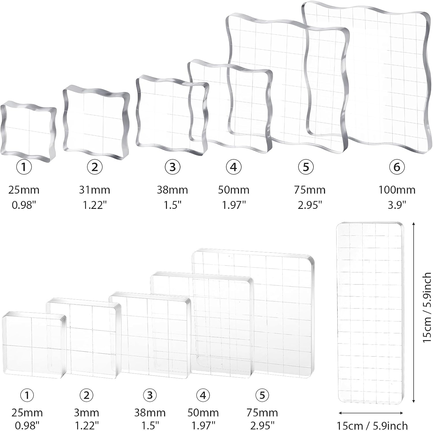 - Stamp Block Set: This set includes 12 pieces of clear acrylic stamp blocks, featuring 6 straight-edged and 6 wavy-edged designs. The assorted sizes range from 15 x 5 cm to 2.5 x 2.5 cm, ensuring you have the perfect block for any stamping project