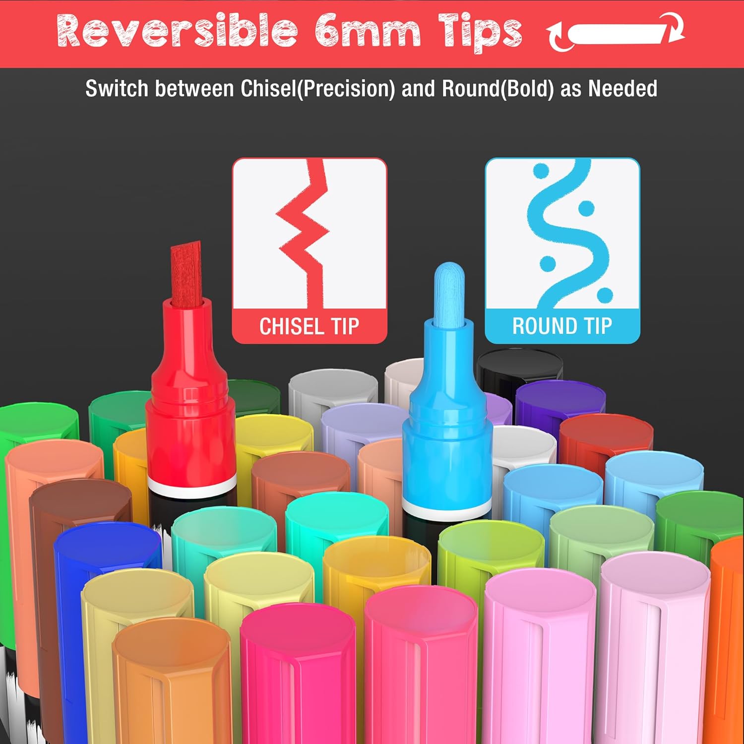 - Precision and Bold Strokes for Diverse Needs Our liquid chalk markers come with 2-in-1 reversible tips (chisel and round), allowing you to easily switch between fine lines and bold strokes to meet your diverse needs. Whether you're creating intricate designs or making bold statements, you can achieve both with ease, giving your creativity free rein