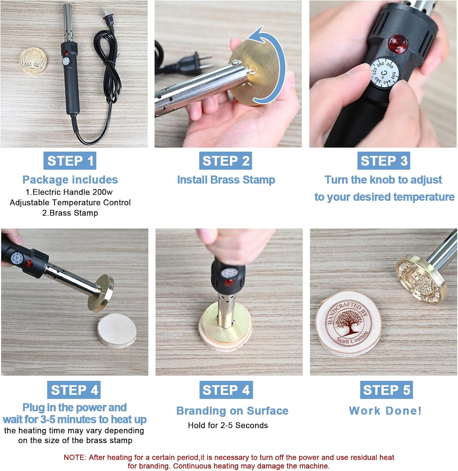 - Easy to Use: This custom wood branding iron is easy to use. Install the brass stamp and plug it in. Heat for 5-8 mins, then turn off the switch. Use the residual heat to brand your item by pressing firmly for 2-5 seconds. Our custom branding iron can easily leave a clear and professional mark.